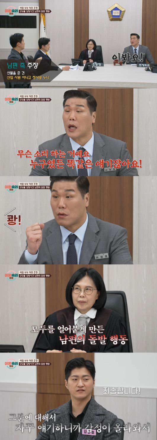 하지만 서장훈은 "이미 다른 여자에게 선물 준 게 문제다"라며 대상이 문제가 아님을 짚었고 이를 듣던 남편은 돌연 책상을 '쾅' 내려쳤다.