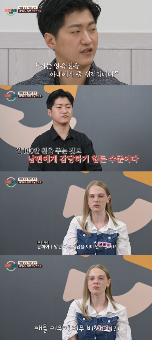 또한 남편은 양육비와 함께 위자료를 분할 지급하겠다며 월 100만 원을 이야기했다. 아내는 "사실 조금이라고 생각했는데 남편 월급을 이미 안다. 어쩔 수 없이 그거밖에 못 받는다는 걸 알고 있다"고 전했다.