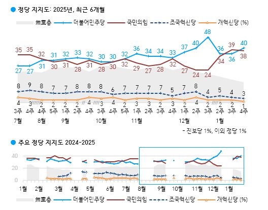 한국갤럽이 지난 21~23일 전국 만 18세 이상 1000명을 대상으로 실시한 1월 4주차 정당 지지도 조사에 따르면 국민의힘은 38%, 민주당은 40%로 각각 집계됐다. 이어 조국혁신당 3%, 개혁신당·진보당·이외 정당/단체 각각 1%, 지지하는 정당 없는 무당(無黨)층 15%로 나타났다.