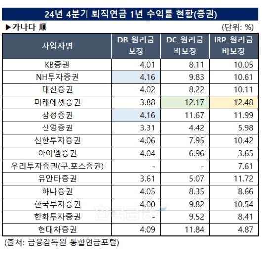 미래에셋증권은 2024년 4분기 말 기준 IRP 원리금 비보장형 1년 수익률이 12.48%로 전 업권 중 1위였다.