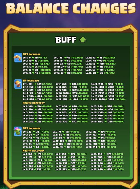 파이어볼(Fireball)은 마지막 업그레이드 범위가 조정되었으며, 일렉트로 부츠(Electro Boots)와 투명 마법은 각각 성능이 다소 제한된다. 반면, 바바리안 킹의 뱀프스태쉬(Vampstache), 바바리안 퍼펫(Barbarian Puppet), 아처 퀸의 아처 퍼펫(Archer Puppet), 그랜드 워든의 라이프 젬(Life Gem), 로얄 챔피언의 로얄 젬(Royal Gem) 등은 상향 조정되어 초보 유저나 특정 전략에서 더 유용하게 사용할 수 있도록 개선된다.