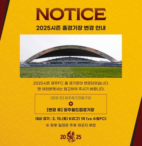 (서울=연합뉴스) 이영호 기자 = 프로축구 K리그1 광주FC가 2월 15일 예정된 수원FC와 2025시즌 K리그1 홈 개막전 경기장을 광주축구전용구장에서 광주월드컵경기장으로 변경한다고 24일 밝혔다.