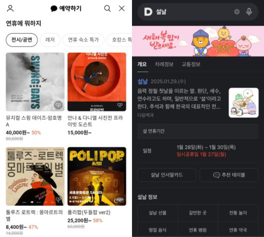 포털 다음(Daum)은 설 연휴에 유용하게 활용할 수 있는 각종 정보를 한데 모았다. 다음에 설날을 검색하면 설날 차례 정보와 교통정보는 물론, 연휴에 문 여는 병원과 약국을 찾아볼 수 있다. 또한 올 설 연휴가 긴 만큼 설날에 즐길 놀이와 장소 등의 검색 결과도 제공한다.