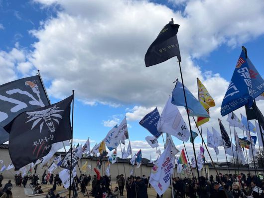 25일 ‘윤석열 즉각 퇴진! 사회대개혁! 범시민대행진 민주주의 수호 평화행진’을 앞두고 각양각색의 깃발들이 광화문 앞에 모였다. 임재희 기자 |