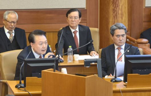 윤석열 대통령이 23일 서울 종로구 헌법재판소에서 열린 본인의 탄핵심판 4차변론에서 증인으로 출석한 김용현 전 국방부 장관에게 직접 증인신문을 하고 있다. (사진=헌법재판소) |