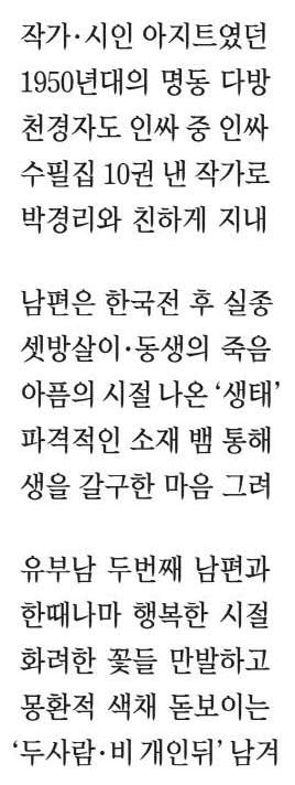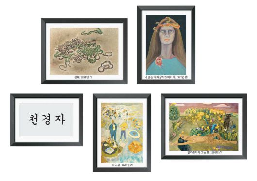 천경자의 두 번째 남편은 1960년 참의원(상원)에 당선됐지만, 1961년 5·16 군사정변 이후 교도소에 수감됐습니다. 남편이 옥살이를 마치고 두 사람은 함께 서울에서 생활했습니다. 천경자는 이 행복한 시절을 그림으로 표현했습니다. '두 사람'에서 남녀는 커피를 마시며 오붓한 시간을 보내고 있습니다. 두 사람에게 근심은 없어 보입니다. 배경에는 화려한 꽃들이 만발해 있고, 테이블 위 화병에도 꽃이 가득 꽂혀 있습니다. 천경자는 당시 느낀 행복을 환상적이고 몽환적인 색채로 표현했습니다. '비 개인 뒤'도 작가의 즐거움을 보여줍니다. 앞으로 맑은 날만 있을 것처럼 집 밖에는 우산들이 펼쳐져 있습니다. 천경자는 강렬한 원색을 흰색으로 중화한 채색화를 그렸습니다. 그는 동양화를 전공했지만, 이 같은 채색 기법은 서양의 유화를 연상시킵니다.