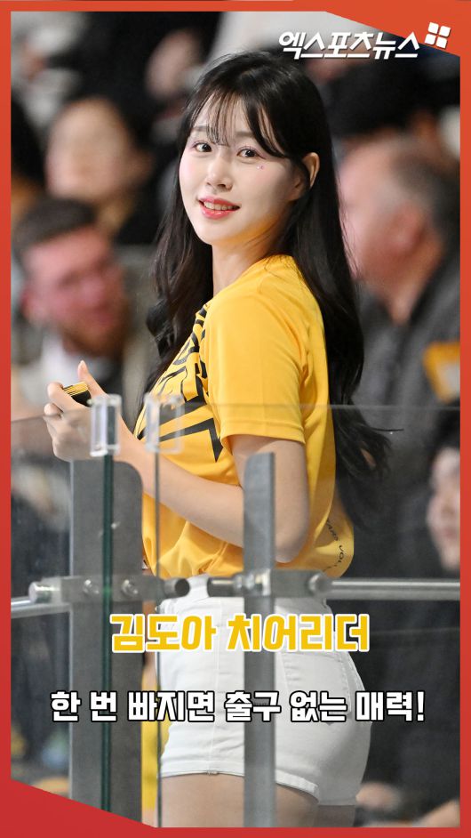 (엑스포츠뉴스 장충, 김한준 기자) 26일 오후 서울 장충체육관에서 열린 ‘도드람 2024-2025 V-리그’ 우리카드와 KB손해보험의 경기, 김도아 치어리더가 열띤 응원을 선보이고 있다.김한준 기자 kowel@xportsnews.com