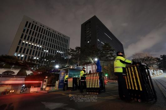 서울중앙지검에 배치된 경찰 - 검찰 비상계엄 특별수사본부가 내란 우두머리 혐의를 받는 윤석열 대통령을 구속 상태로 재판에 넘긴 26일 오후 서울 서초구 서울중앙지방검찰청에 경찰이 배치돼 있다. |