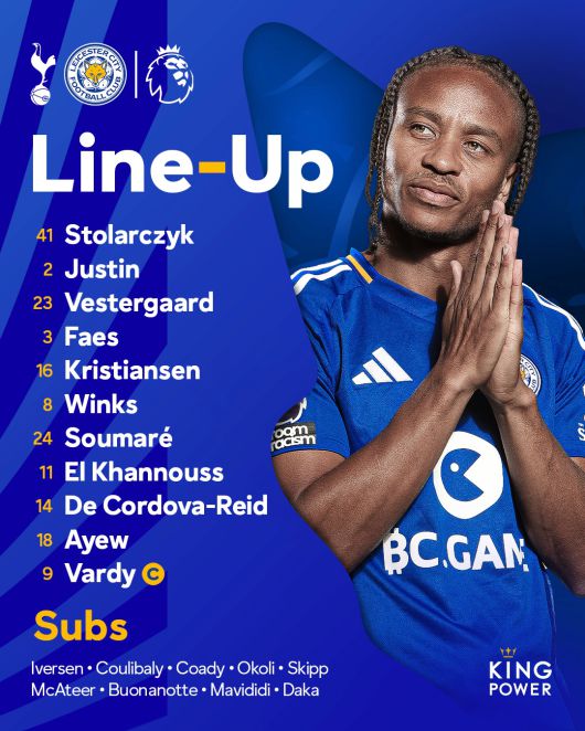 맨체스터 유나이티드 레전드 출신 뤼트 판 니스텔루이 감독의 레스터 시티는 4-2-3-1 전형으로 맞섰다. 야쿠프 스톨라르치크가 골키퍼 장갑을 착용했고 빅토르 크리스티안센, 야니크 베스테르고르, 바우트 파스, 제임스 저스틴이 백4를 구축했다. 부바카라 수마레와 해리 윙크스가 허리를 받쳤고 바비 데코르도바 레이드, 빌랄 엘카누스, 조던 아예우가 2선에서 최전방의 제이미 바디를 지원했다.