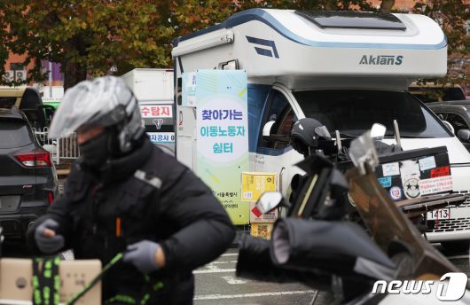 서울 서초구 서울고속버스터미널 주차장에서 '찾아가는 이동노동자 쉼터'가 운영되고 있다. ⓒ News1 김민지 기자 |