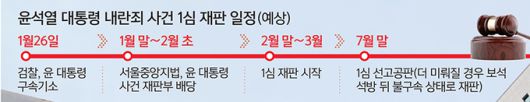통상 형사재판은 기소 시점부터 1∼2개월 후 첫 재판이 시작된다. 서울중앙지법은 이르면 2월 말쯤 공판준비기일을 열 것으로 전망된다. 재판부는 윤 대통령의 구속기간이 끝나기 전인 7월 말 전에는 선고공판을 열 것으로 예상된다.