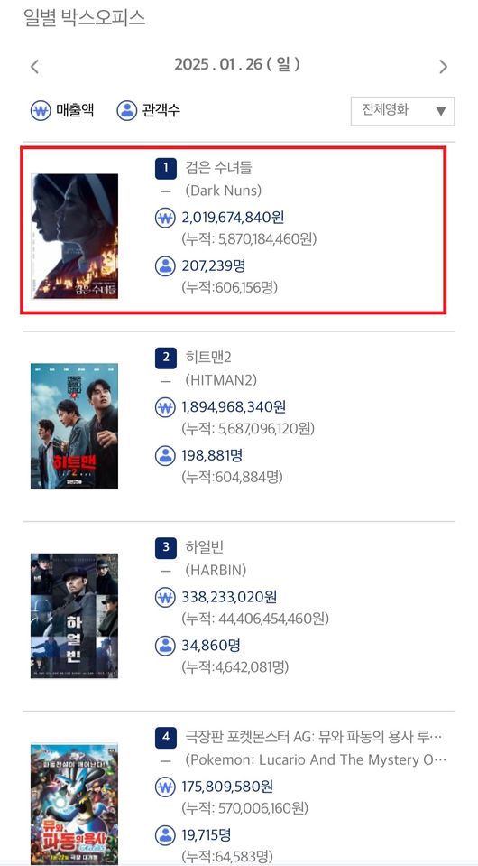 ‘검은 수녀들’은 강력한 악령에 사로잡힌 소년을 구하기 위해 금지된 의식에 나서는 사람들의 이야기를 그린 영화다. 개봉 첫날 16만 관객을 동원했고, 개봉 이후 3일 연속 박스오피스 1위를 차지한 영화 ‘검은 수녀들’이 개봉 첫 주 누적 관객 수 606,156명을 기록하며 흥행 독주를 이어가고 있다. 또한, 동시기 개봉한 인도네시아에서는 개봉 첫 주 약 31만명을 동원하여 역대 인도네시아에서 개봉한 한국 영화 중 최고 오프닝 성적을 기록하며, 개봉 이후 3일 연속 박스오피스 1위를 차지하고 있다. 악령에 사로잡힌 소년을 구하기 위한 캐릭터들의 간절함과 드라마틱한 전개로 호평을 이끌어내고 있는 ‘검은 수녀들’은 단 3일간 국내 60만 명의 누적 관객을 동원, 신년 극장가에 활력을 불어넣으며 시장 확대를 견인하고 있다. 특히 드라마틱하고 짙은 여운을 남기는 이야기에 대해 다양한 연령대 관객들의 입소문이 이어지고 있어 1월 27일(월) 임시공휴일부터 이어지는 설 연휴 극장가에 더 거센 흥행세를 이어갈 것으로 기대된다.