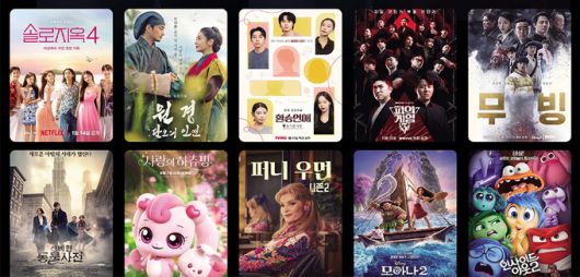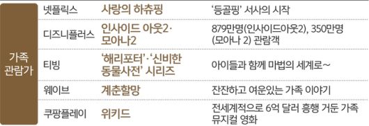 ‘가족물’로는 디즈니 애니메이션만 한 것이 없다. 디즈니플러스는 지난해 극장 개봉에서 각각 879만명과 350만명의 관람객을 기록한 ‘인사이드아웃2’와 ‘모아나2’를 최근 선보였다. 넷플릭스에서는 극장을 눈물바다로 만들었던 영화 ‘사랑의 하츄핑’이 시청자 선택을 기다리고 있다. 유아 애니메이션 ‘캐치 티니핑’ 시리즈의 ‘프리퀄’(전사편)로 로미 공주와 그의 ‘짝궁핑’인 하츄핑이 만나게 된 과정을 그렸다. 캐릭터가 무한증식하며 장난감 세계를 평정해, 부모들의 ‘등골핑’ ‘파산핑’으로 불리는 티니핑의 시작인 셈이다.