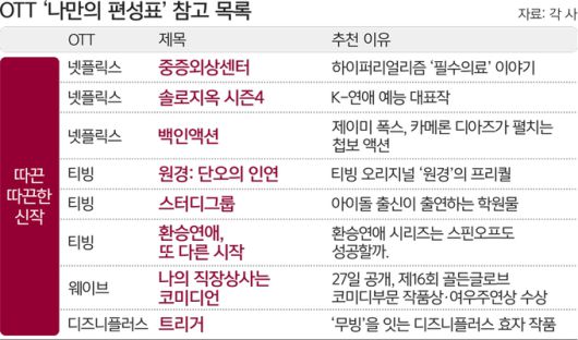 지난해 하반기 방송에서 높은 시청률을 보인 ‘굿파트너’(웨이브·넷플릭스) ‘낮과 밤이 다른 그녀’(티빙·넷플릭스) 등도 선택을 기다리고 있다.