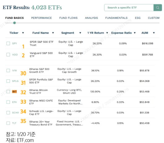 28일 삼성증권 리서치센터에 따르면 ETF 정보 사이트 ETF닷컴을 분석한 결과 지난 20일 기준 현물 비트코인 ETF인 IBIT가 자산규모 32위로 올라섰다. IBIT는 지난해 1월 상장해 1년 만에 거둔 성과다. 미국에 상장된 ETF가 4000여개인 점을 감안하면 급격한 성장세다.