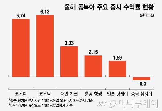중국 상하이를 제외한 다른 아시아 증시도 강세였지만 한국과 비교해서는 수익률이 떨어졌다. 대만 가권지수는 연초부터 지난 22일까지 3.03% 올랐고, 홍콩 항셍지수와 일본 닛케이지수도 연초부터 24일까지 각각 2.26%, 1.59% 올랐지만 상하이종합지수는 0.3% 내리면서 홀로 약세였다.