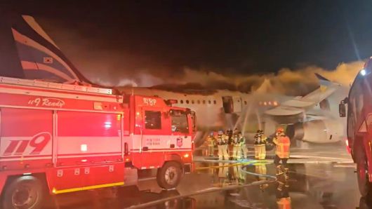 ▲ 김해공항 에어부산 항공기 화재 진화 작업