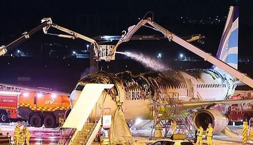 부산강서소방서는 이날 새벽 브리핑을 통해 "소방 당국이 도착했을 때 기체 꼬리 부분부터 동체 중간까지 불이 번져 있었고, 승객과 승무원 모두 대피한 상황이었다"며 "화재 당시 항공유 3만5000파운드가 기체 양쪽 날개에 실려 있었기 때문에 불이 더 번지지 않도록 방어하는 데 주력했다"고 설명했다.