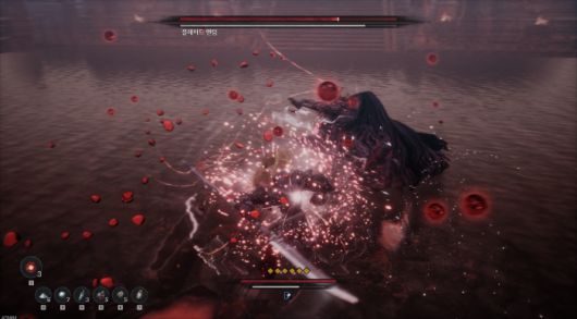 그 덕분에 적의 패턴에 익숙해진 후에는 더욱 적극적으로 공세를 취할 수 있습니다. 소울라이크의 보편적인 형태인 ‘거리 조절 → 패턴 회피 → 공격’이 아니라 ‘공격 → 직전가드 → 공격’으로 액션을 이어가죠. 직전가드 또한 타격감이 상당히 좋고 공격 수단의 역할을 겸하기에 시종일관 자신이 전투를 주도한다는 인상을 받습니다.
