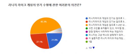전반적으로 리니지라이크 게임의 인기가 그리 오래 지속되지는 않을 것이라는 응답이 우세한 가운데, 적어도 5년 이상 지속할 것이라는 의견을 합하면, 48.9%로 과반에 근접했다.