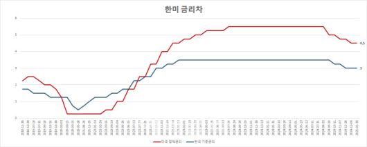 연준의 이번 결정으로 한미 금리 역전폭은 150bp를 유지했다. 코로나19 대유행 시기 미국이 치솟는 인플레이션을 잡기 위해 정책금리를 가파르게 올리면서 2022년 7월 미국의 금리가 우리나라보다 높아진 이후 2년 반 동안 금리 역전 상태가 지속되고 있다.