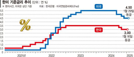 다만 2월 인하 이후 금리 인하 시점은 불투명해졌다는 평가다. 연준이 이날 금리를 동결하면서 한국(3.0%)과 미국의 금리차는 상단 기준 1.50%p로 유지됐다. 미국의 금리인하 폭과 속도가 줄어들 경우 한은 입장에서는 한미 금리차 확대에 따르면 원·달러 환율 상승 가능성을 염려하지 않을 수 없다.