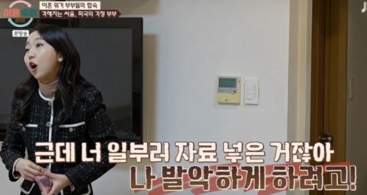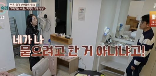 아내는 계속해서 이와 관련 “날 묻으려고 (제출)한 거 아니냐, 너랑 나랑 싸운 걸 해야지 왜 관계 없는 걸 보내냐”며 언성이 높아졌다. 다른 부부의 방에도 중계될 정도. 아내는 “계획적으로 살지마라 , 이건 도청이다”며“악의적으로 이용하라고 내가 보냈나”며 관리비 문제로 또 번졌다. 그러면서 아내는 계속해서 협의 이혼을 원했다.