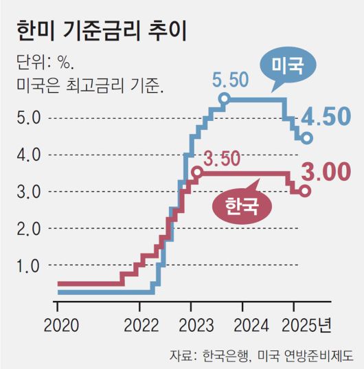 연준이 금리 동결에 나서면서 한은의 금리 인하 결정은 한층 더 어려워졌다. 최근 국내 경기 상황을 고려하면 금리 인하를 통해 경기 부양에 나서야 하지만, 한미 금리 격차 확대로 인한 환율 상승과 금융 시장 불안이 커질 수 있기 때문이다.