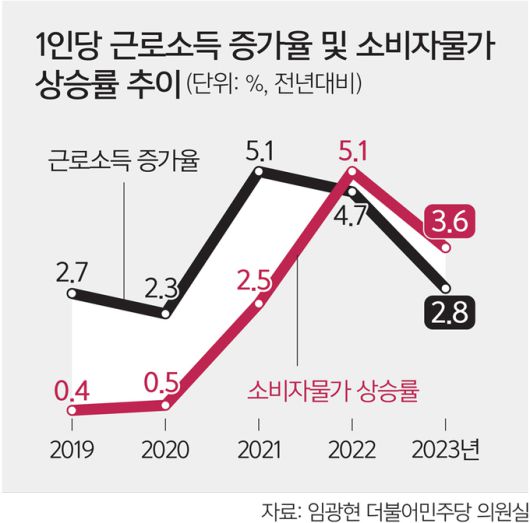 근로자 월급이 ‘찔끔’ 늘어나는 동안 물가는 큰 폭 상승을 이어갔다. 2023년 소비자 물가는 1년 전보다 3.6% 상승해 2022년(5.1%)에 이어 2년 연속 높은 상승률을 보였다.