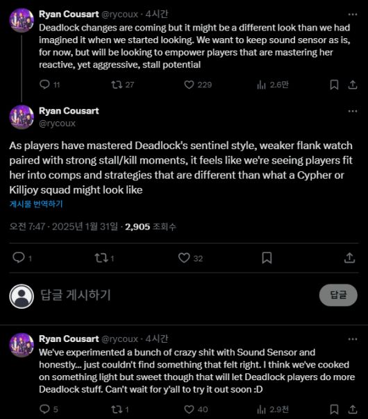 31일 라이언 쿠사트 발로란트 라이브 밸런스 디자이너는 자신의 X에서 데드록의 변경사항에 대해 언급했다.