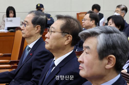 한덕수 국무총리, 박성재 전법무부장관, 조태용 국정원장(왼쪽부터)이 15일 국회 국방위에서 열린 내란혐의 국정조사특위에서 무거운 표정으로 질의를 듣고 있다. 박민규 선임기자 |