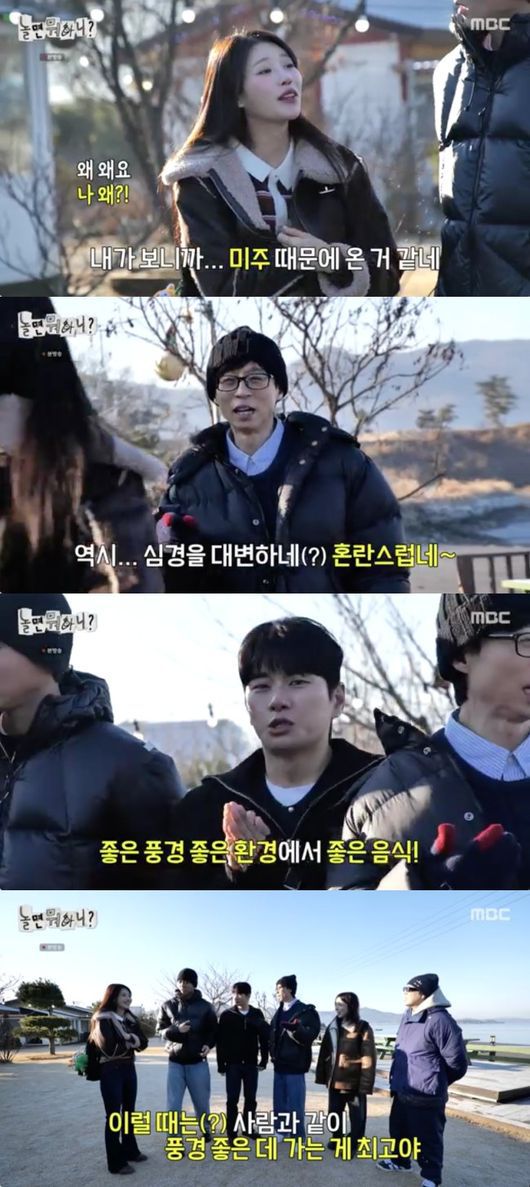 이에 유재석은 “본인 사생활이니까 딥하게 안 들어갈게”라며, “우리도 신경 쓸게 많아. 이럴 때는 사람들과 좋은 풍경 좋은데 가는 게 최고”라고 말했다. 그러면서 멤버들은 미주에게 “외로움 느끼지 않게 가운데 있어”라고 말하면서, 미주를 가장자리에서 가운데로 데리고 왔다.