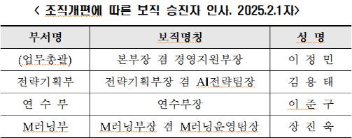 연수원은 조직개편에 따라 승진 인사도 실시했다. 이정민 부장은 업무총괄본부장으로 김용태·이준구·장진욱 팀장 등 중견급 팀장 3명을 각각 전략기획부장, 연수부장, M러닝부장으로 승진시켰다.