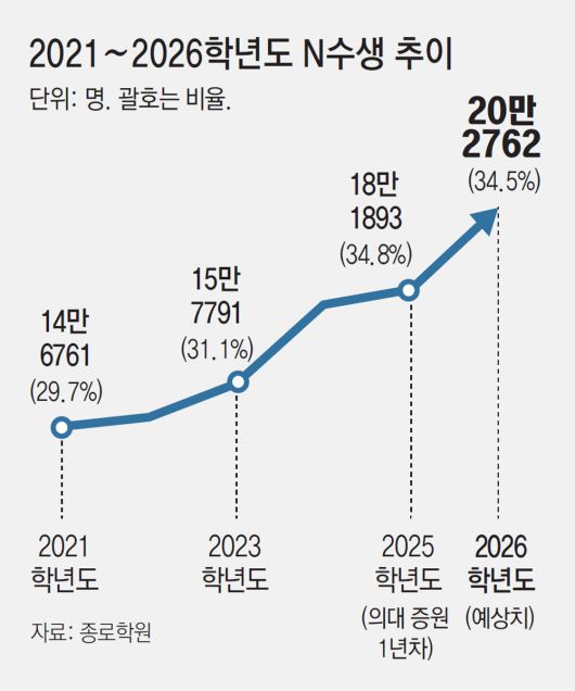 2025학년도 수능 접수자 현황을 살펴보면 고3 수험생이 34만777명, N수생은 18만1893명으로 각각 65.2%, 34.8% 비율이었다. 종로학원은 2026학년도에도 이들 비율이 비슷하다고 가정했을 때 2026학년도 수능 접수자는 고3 수험생 38만5593명, N수생 20만2762명이 될 것으로 예상된다고 설명했다. 종로학원 관계자는 “1994년 수능 도입 이래 고3 수험생과 N수생의 비율은 대체로 7 대 3 수준을 유지했다”고 말했다.