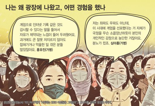 그 시각, 대구광역시 집에 있던 대학생 강지원(가명·21)도 5·18 광주민주화운동을 배경으로 한 소설 ‘소년이 온다’ 작가가 노벨 문학상을 받은 2024년에 우리나라 대통령이 비상계엄을 선포했다는 사실이 도무지 믿기질 않았다. “(계엄으로 인한 국가폭력을) 소재로 한 영화와 책이 많이 나왔고 계엄 위험을 사람들이 다 아는데도 부적절한 상황에서 선포한 거라 되게 놀랐어요.”