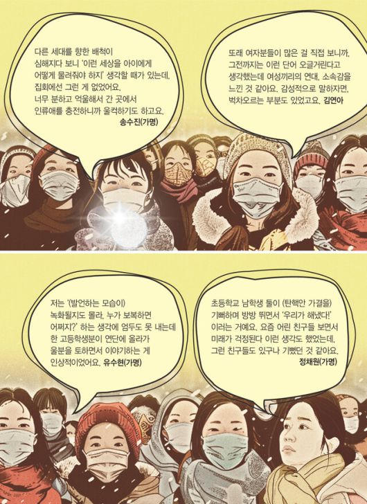 온라인 소통이 일상인 세 사람이 스무살 넘어 처음으로 발 디딘 광장은 “인터넷으로만 보던 것과 달리 상식적이고 따뜻한 사람이 많고”(서연), “생각보다 다양한 연령층이 있으며”(지원), “많은 사람이 한마음 한뜻으로 외칠 수 있는”(하은) 곳이었다.