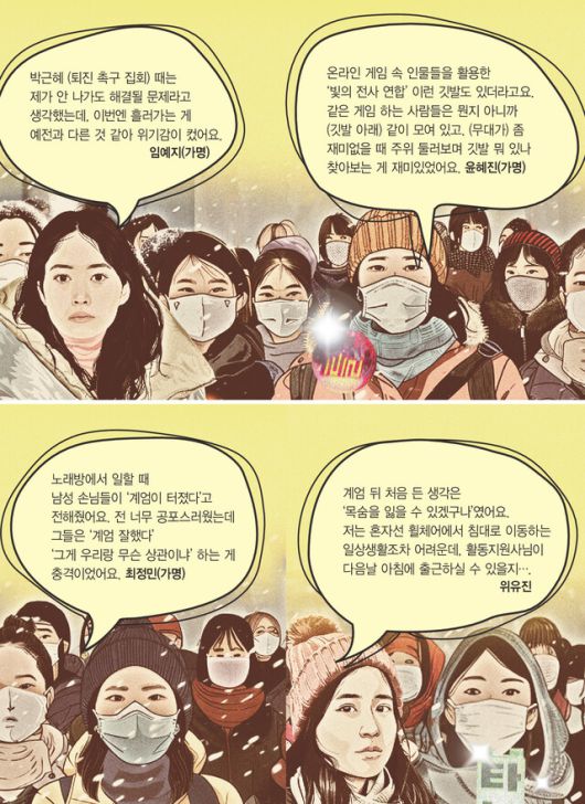 그날 밤, 서울 지하철 4·7호선 이수역(서울 동작구 사당동과 서초구 방배동 경계) 인근 부모님 집에 있던 직장인 박민아(가명·37)는 국군의 날도 아닌데 탱크 비슷한 차량이 여러대 움직이는 의아한 광경을 목격했다. 동네 바로 옆엔 수도방위사령부(수방사)가 있다. 윤석열 대통령이 비상계엄을 선포했다는 속보가 나오자 부모님은 “국회부터 지켜야 한다”며 급히 차를 몰고 여의도로 향했다. 전두환 신군부가 1980년 비상계엄을 전국으로 확대한 뒤 무슨 일이 벌어졌는지를 잘 아는 부모님의 반응에 “이건 영화가 아니구나!” 정신이 번쩍 들었다. 민아 역시 부랴부랴 여의도로 달려갔다. 그사이 계엄이 해제됐지만, 대통령의 행각이 생각하면 할수록 “너무 괘씸해” 날이 새도록 잠을 이루지 못했다.