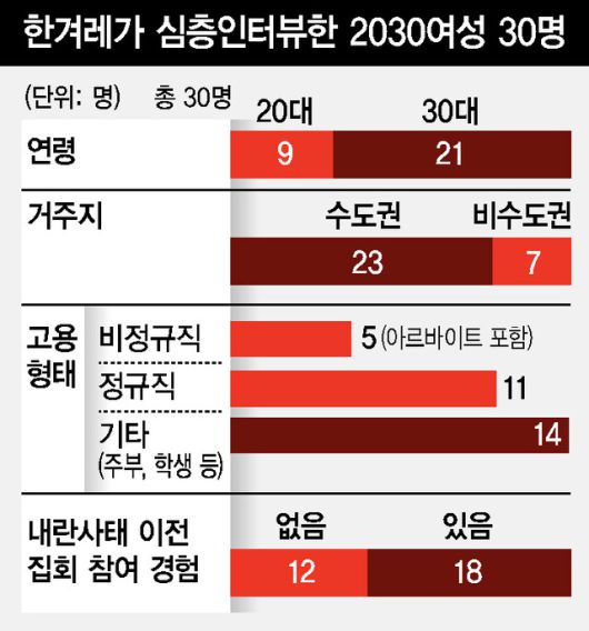 ‘12·3 내란’ 직후 광장에 모인 응원봉은 반민주적이고 반헌법적인 윤석열 정권의 퇴장을 요구하는 강렬한 불빛이었다. 그러나 직무가 정지된 대통령 윤석열은 계엄 선포 정당성을 강변했으며, 그에 맞춰 퍼져나간 음모론과 폭력 선동은 초유의 법원 습격 사태로 치달았다. 거대 극우 세력이 민주주의를 위협하는 충격적인 현실에도, 여전히 연대와 공감을 바탕으로 새 세상을 희망하는 불빛이 반짝이고 있다. 한겨레는 내란사태 두 달을 맞아 ‘탄핵 광장’에 섰던 20~30대 여성 30명의 목소리를 들어보았다. 글로벌리서치에 의뢰해 거주지(수도권·비수도권), 직업(학생·직장인·주부 등), 고용 형태(정규직·비정규직) 같은 여러 조건을 바탕으로 1986~2005년생 23명을 선정했다. 이런 방식의 조사에서 배제될 우려가 있는 성소수자·이주배경·장애여성 등 7명을 더해 모두 30명을 1월12일부터 나흘간 전화로 심층인터뷰했다.
