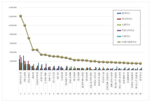 예능 프로그램 브랜드평판 1위를 기록한 미스터트롯3 브랜드는 참여지수 2,473,183 미디어지수 3,388,121 소통지수 1,726,637 커뮤니티지수 2,913,094 시청지수 1,643,454가 되면서 브랜드평판지수 12,144,490으로 분석됐다. 지난 1월 브랜드평판지수 7,374,191과 비교해보면 64.69% 상승했다.