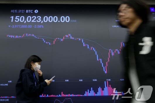 (서울=뉴스1) 장수영 기자 = 3일 오후 서울 강남구 업비트 고객센터 전광판에 가상자산 비트코인 종목의 가격이 하락해 1억 5000만원대를 나타내고 있다. 도널드 트럼프 미국 대통령이 멕시코와 캐나다, 중국에 관세를 부과하기로 결정하면서 위험자산으로 분류되 비트코인 등 대다수 가상자산의 가격이 큰 하락률을 보이고 있다. 2025.2.3/뉴스1