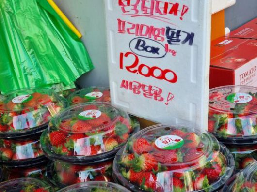 가게에서 만난 30대 주부 A씨는 "요즘 과일값이 너무 비싼데 어린이집 엄마들 사이에서 이 집 딸기가 싸다는 소문을 듣고 15분 걸어왔다"면서 "이 가격이면 마트에서 500g밖에 못 샀을 것"이라고 말했다. 얼마 전 새로 생긴 이 가게는 값싼 가격이 입소문 나면서 인근 과일·야채 수요를 빠르게 흡수하는 중이다. 퇴근 시간에는 더 발 디딜 틈이 없다. 저녁이 되면 인기 품목인 딸기는 늘 품절이다. 주말을 빼곤 늘 한산한 5분 거리 대형마트와 비교되는 풍경이다.