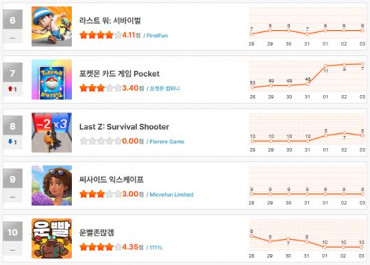 '포켓몬 카드 게임 Pocket'은 신규 확장팩 출시 효과로 46위에서 7위까지 크게 점프했다.