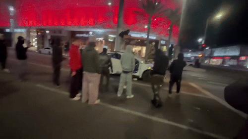 [서울=뉴시스] 2025년 1월 25일 새벽 미국 로스앤젤레스 베벌리 센터 인근 거리에서 자율주행 무인 택시 웨이모가 군중들에 의해 파손되고 있다.(사진=엑스 옛 트위터 갈무리) *재판매 및 DB 금지 |