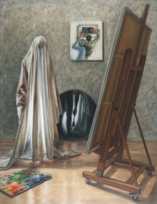 2월 15일까지 서울 한남동 갤리리바톤에서 열리는 이번 전시에서 자화상 ‘대화(Conversation)’는 눈여겨볼 작품이다. 궁정 화가였던 벨라스케스의 유명한 작품 ‘시녀들’의 시선 구성을 일부 따른다. 벨라스케스처럼 작품 속 화가 역시 이젤 앞에 서 있다. 천을 뒤집어쓴 탓에 누군지 알아볼 수 없지만, 작가는 “안 보이기 때문에 인물의 존재감이 커지는 역설이다”라고 말한다. 벽에 걸린 작품은 ‘극 중 극’처럼 그림 속 세상이 펼쳐진다. 작가는 작은 구멍을 통해 세상을 보는 장면을 가리키며 ‘도넛 가운데 구멍(환상)이 아닌 도넛(현실)을 보라’고 말한 데이비드 린치 감독을 언급했다. 거울로 비친 동양화 붓은 지난 개인전 때 갤러리바톤에서 선물 받은 것이라는 비하인드 스토리도 덧붙였다.