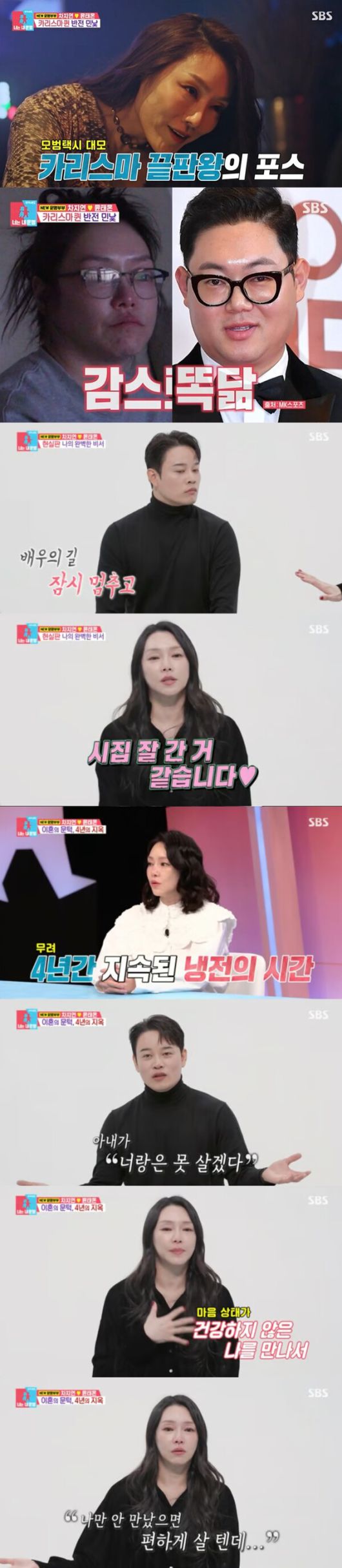 이런 상황 속에서 두 사람의 냉전은 4년간 지속됐고, 결국 차지연이 이혼을 요구하기도 했다는 사실도 공개했다. 차지연은 "이혼을 앞두고 '더블 캐스팅'이라는 오디션 프로그램에 저는 심사위원으로, 남편은 참가자로 출연했다. 그때 남편이 무대 위에 올라오는데 기분이 너무 이상했다. 사랑하는 감정, 미운 감정 다 들었는데 그때 굉장히 괴롭고 미안했다"고 회상했다.