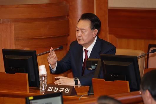 윤석열 대통령이 지난달 23일 서울 종로구 헌법재판소에서 열린 탄핵심판 4차 변론에 출석해 마이크를 조작하는 모습. [사진 출처 = 공동취재단, 연합뉴스] |