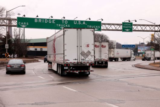미국과 캐나다를 연결하는 '앰버서더 브릿지'에서 화물 차량들이 이동하고 있다. AFP=연합뉴스 |