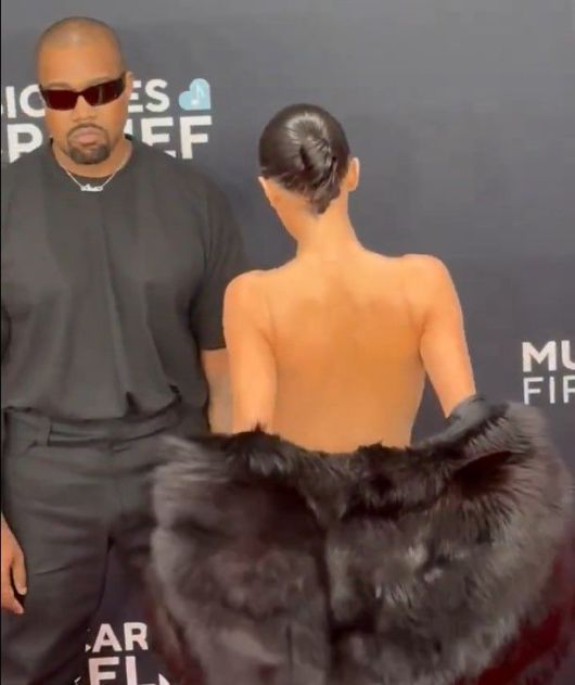 반면 칸예 웨스트는 검은색 티셔츠와 검은색 바지를 입고 선글라스까지 착용한 온전한 차림새였다. 두 사람은 카메라 앞에서 무표정을 유지하며 사진 촬영에 임했다.
