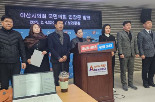 국민의힘 소속 아산시의원들이 4일 기자회견을 하고 있다. |