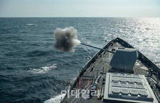 구축함 강감찬함이 해상 실사격 훈련을 하고 있다. (사진=해군) |